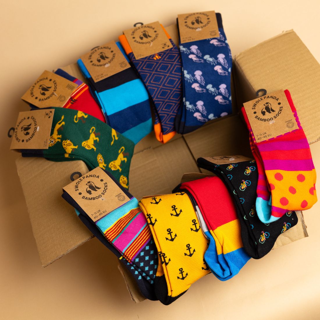 Grab a box of 10 or 20 pairs of premium bamboo socks, pulled at random from the full Swole Panda collection. You’ll get a mixed bag of styles, patterns, and colours — no two boxes are the same.
